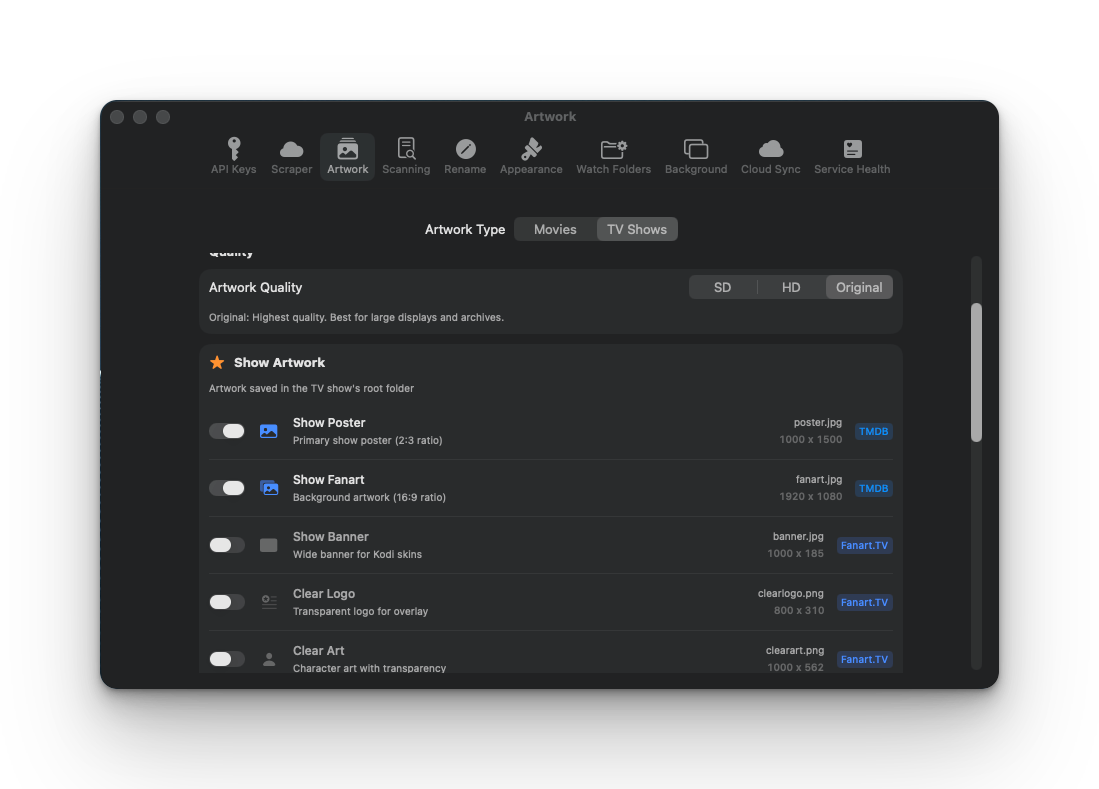 Choose exactly which artwork types to download. Posters, fanart, banners, logos - pick what you want at the quality you need.